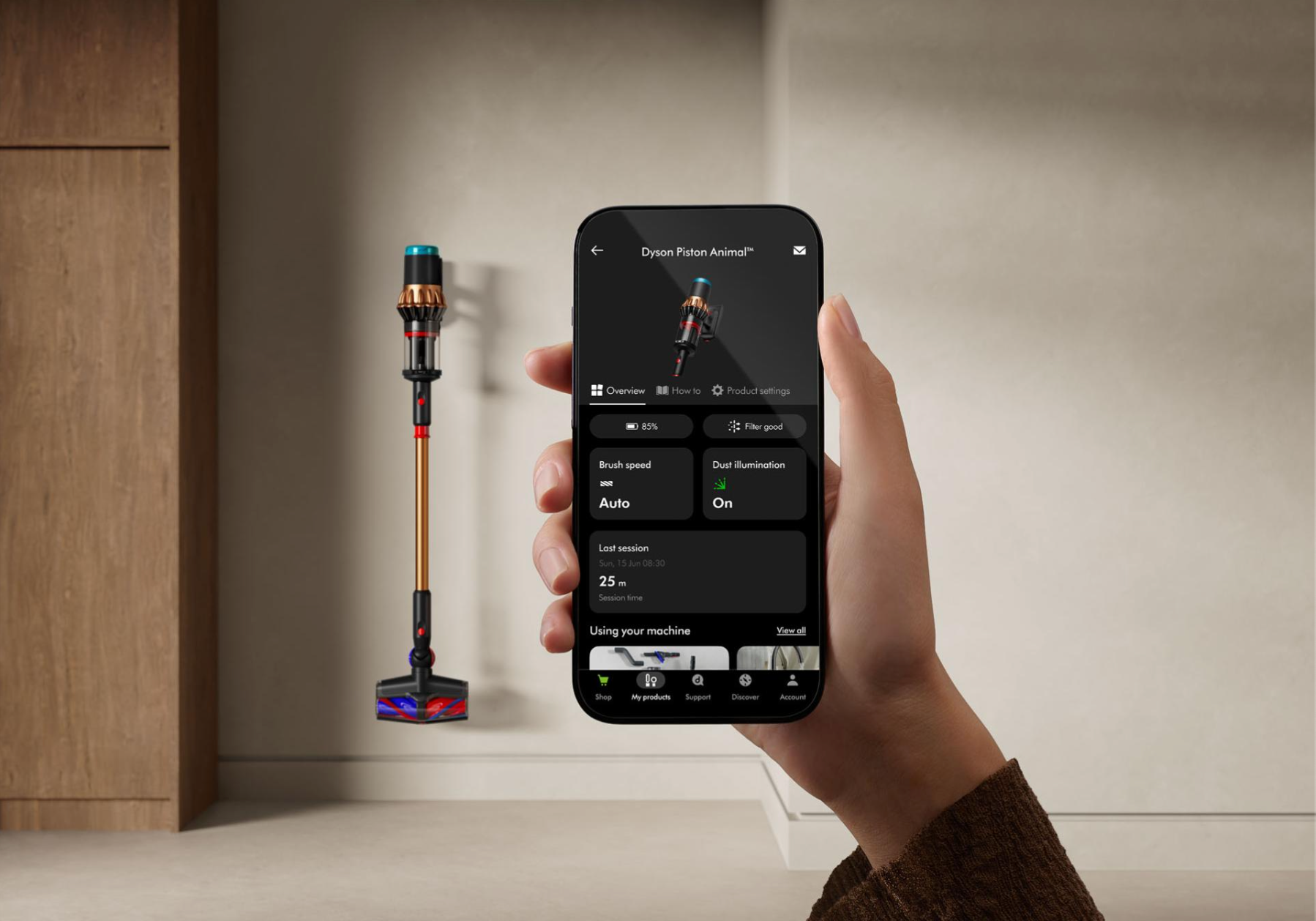 Download de MyDyson™-app en ontvang automatisch meldingen over nieuwe software-updates, zoals onderhoudsinstructies en verlichtingsregeling.